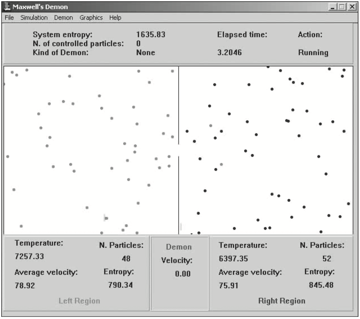 The program (built for Windows) shows two chambers filled with particles, all moving and bouncing according to physical laws. The user can define the “demon’s logic”: