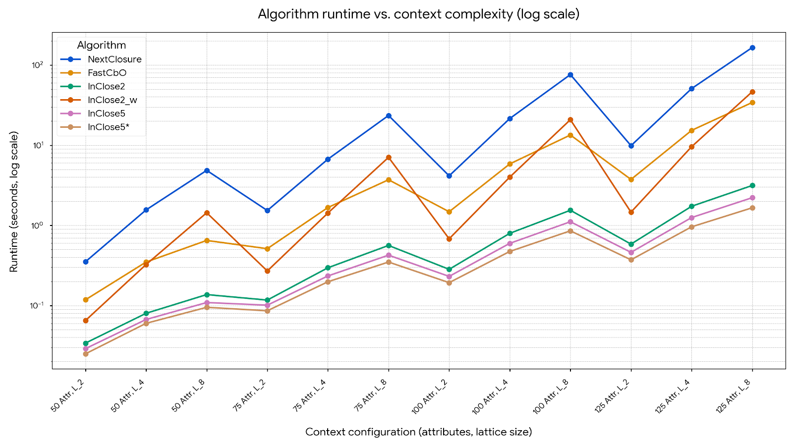NextClosure and InClose2_w) shoot up. Our new versions (green, purple, orange) stay flat. Less time is better.